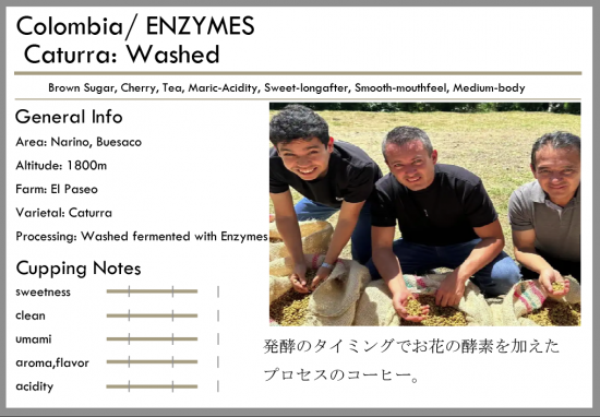 こちらのコーヒーは【嫌気性発酵の後にもう一度発酵をさせるタイミング(ダブルファーメンテーション)でお花由来の酵素を加え、更に発酵を促進させて最後にウォッシュドで仕上げたコーヒー】です! インフーズドの様にフレーバーを加えたものではございません。